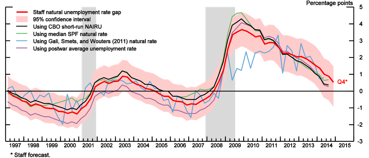 This memo analyzes the amount of “slack” or underutilization of resources in mid-2014, primarily focusing on the unemployment rate gap. It compares the FRB staff’s unemployment rate gap with alternative measures, including other unemployment rate gaps, output gaps, manufacturing capacity utilization, and various labor market indicators. Although many indicators align with the staff’s unemployment rate gap, some, like the JOLTS job openings rate, suggest a tighter labor market. Conversely, the wide labor force participation rate gap and elevated involuntary part-time employment suggest the unemployment rate gap might understate the true degree of labor market slack. The memo concludes by noting the wide range of slack estimates and the potential for alternative indicators to suggest either more or less slack than the unemployment rate gap, especially given the absence of appreciable acceleration in wages and prices.